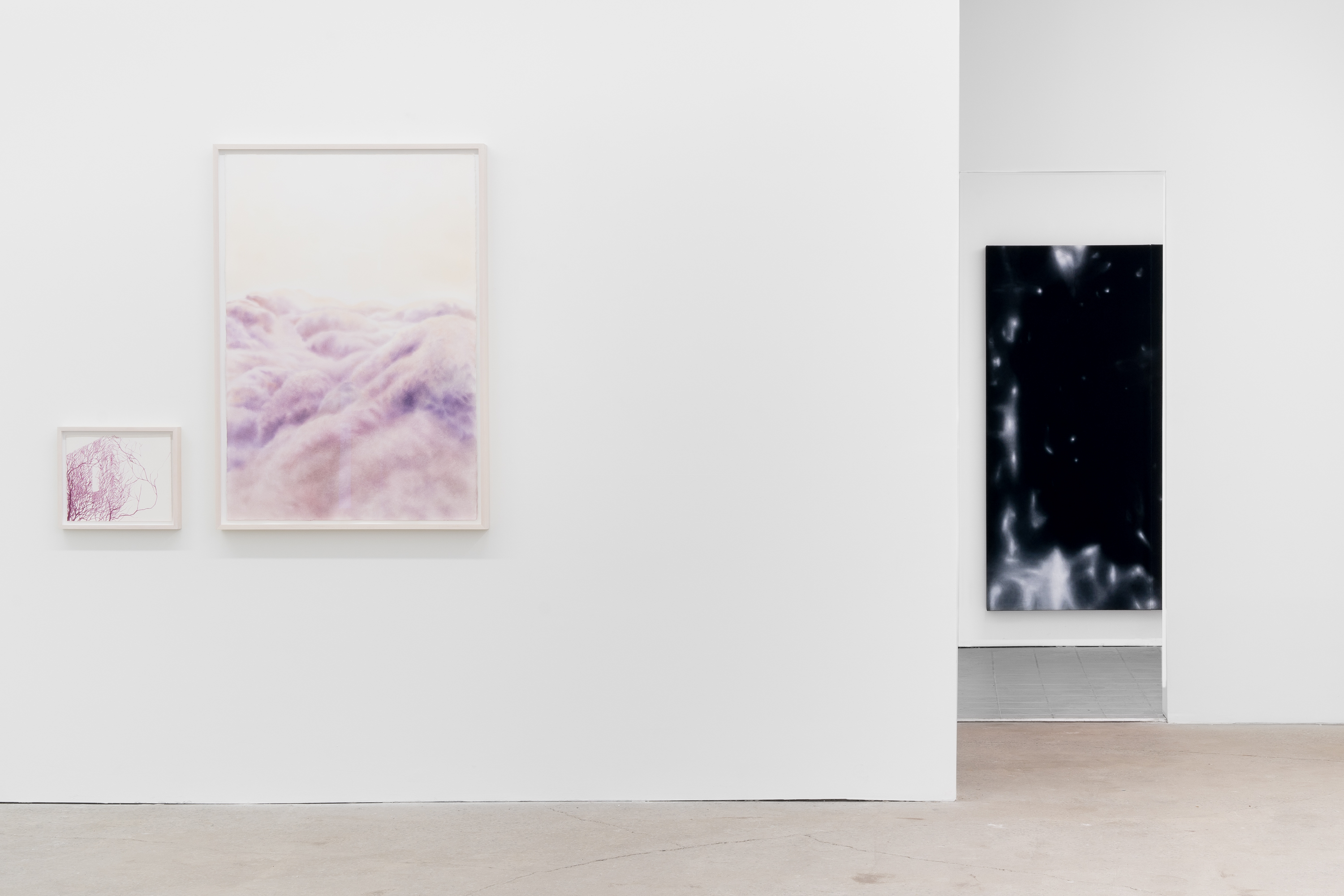 Using a spectrogram, the soundtrack of Alvin Lucier's I Am Sitting in a Room is translated into a diagram, from which fragments are extracted and assembled into ghostly visual landscapes. This interchangeability of sound to the image enables him to explore the sonic characteristics of the work with an alternative sensibility to hearing and generates almost infinite possibilities for visual compositions. Not completely abandoning the auditory aspect for pictorial representation, the structure of the paintings presented is composed of soundproofing materials, influencing the very acoustic imprint of the exhibition space.”